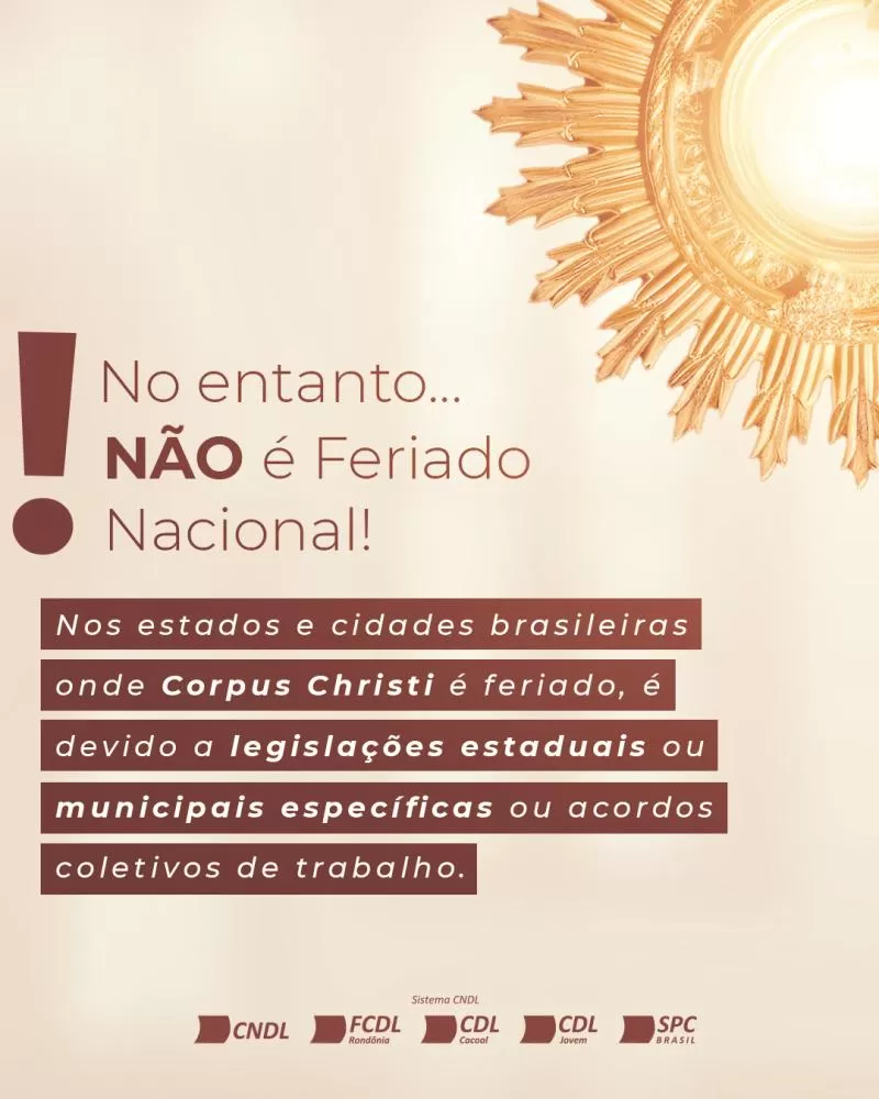 Em Rondônia, a folga vai depender de onde você mora ou trabalha. Os municípios têm autonomia para transformar Corpus Christi em feriado religioso, desde que exista uma lei municipal específica.